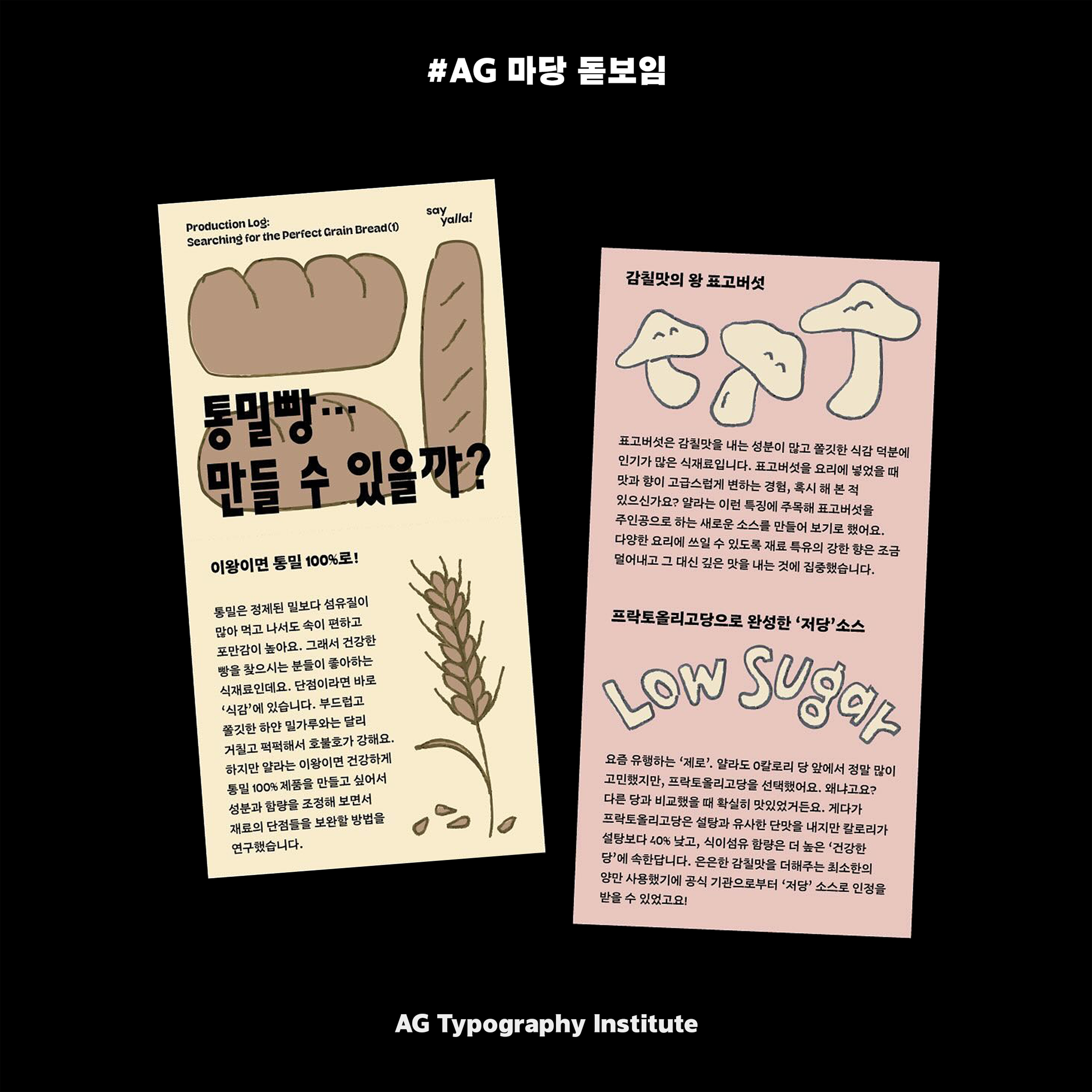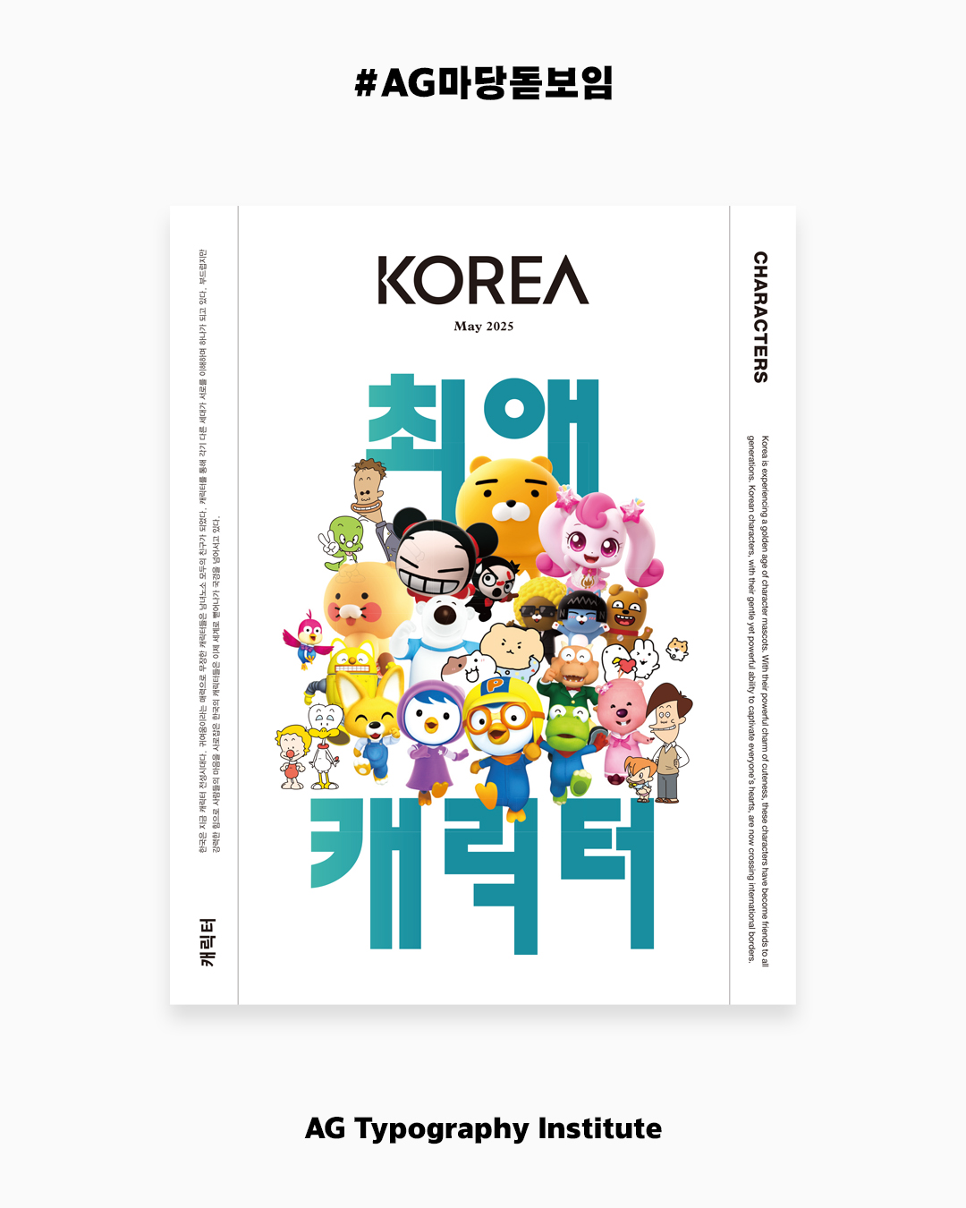 《AG 마당 돋보임》은 연구소가 소장하고 있는 ‘마당체’ 원도, 한글 174자를 기준으로 한글 11,172자와 라틴은 한글의 특징을 담아 설계되었습니다. 원도는 디자이너 안상수가 잡지 『마당』의 아트 디텍터로 재직할 당시 그렸고, 1995년 안상수가 설계한 〈안상수체〉의 전 단계인 네모틀 조합형 글꼴입니다. 속공간이 극단적으로 작고, 글자사이도 매우 촘촘하며 닿자와 글자너비가 불규칙한 것이 특징입니다. 또한 방안지에 제도하듯 그렸기에 곡선을 최대로 배제한 기하학적 형태로 구성되어 있으며, 속공간이 극단적으로 작아 복고풍 레터링에 가깝습니다. 《AG 마당 돋보임》은 ‘마당체’ 원도의 주된 특징인 촘촘한 글자사이를 유지하였고, 첫닿자 크기를 일률적으로 맞추었습니다. 그리드를 활용하여 원도에서 나타난 불규칙한 글자너비를 9가지로 정제한 가변너비 글꼴입니다. 모든 획과 공간, 글자사이는 엄격한 그리드 규칙 내에서 움직이며 섞어짜기를 할 경우 한글, 라틴 대문자, 숫자는 윗선에 글줄흐름선이 형성되고, 라틴 소문자는 아랫선에서 글줄흐름선이 형성되는 독특한 구조를 가지고 있습니다. 《AG 마당 돋보임》은 이러한 80-90년대의 복고풍 감성에 일정한 규칙을 부여하여 현대와 어울리도록 새로운 인상을 더하였습니다.